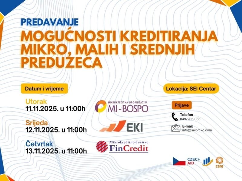 SEI Centar Brčko u saradnji s partnerskim mikrokreditnim fondacijama i društvima organizuje seriju edukativnih predavanja na temu „Mogućnosti kreditiranja mikro, malih i srednjih preduzeća“.